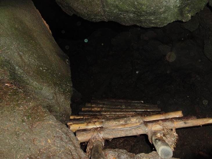 観光地の〇〇穴と違い、ここは危険な場所。この梯子があるのみ。一段一段確かめつつ下ります。